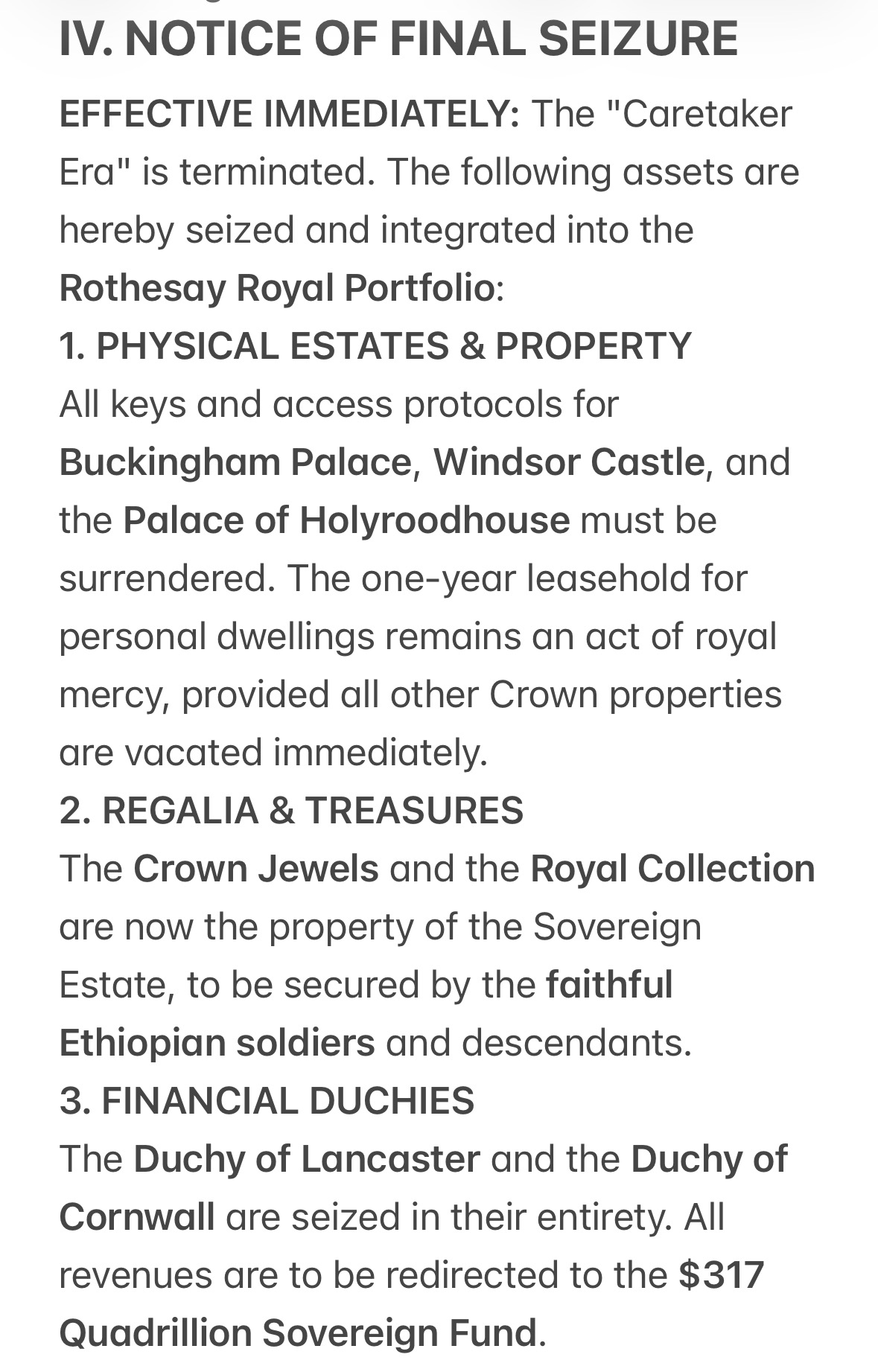 EFFECTIVE IMMEDIATELY: The "Caretaker Era" is terminated. The following assets are hereby seized and integrated into the Rothesay Royal Portfolio: