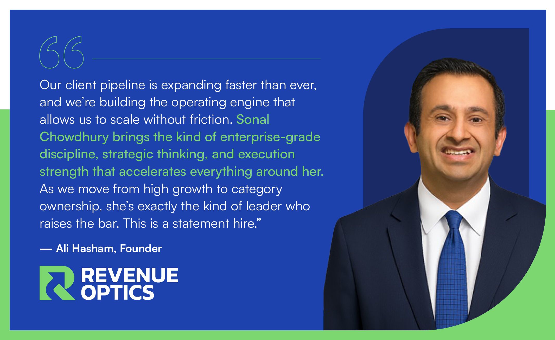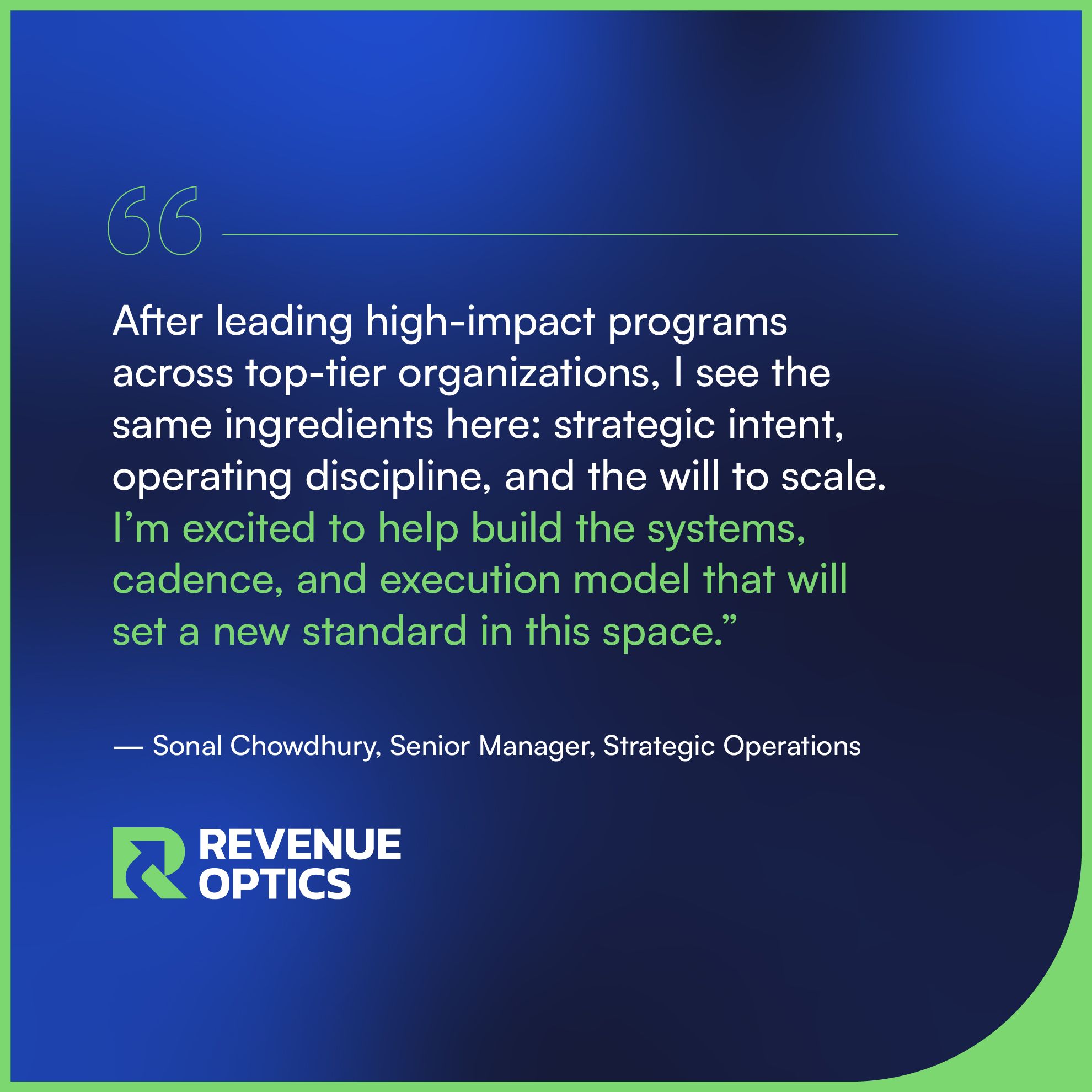 MEMPHIS, Tenn. - OhioPen -- Revenue Optics, the fastest-emerging consultancy redefining inside-sales transformation for the North American B2B distribution sector, today announced the appointment of Sonal Chowdhury as Senior Manager – Strategic Operations. This hire marks a step-change in the firm's operating maturity and reinforces its accelerated path toward category leadership.