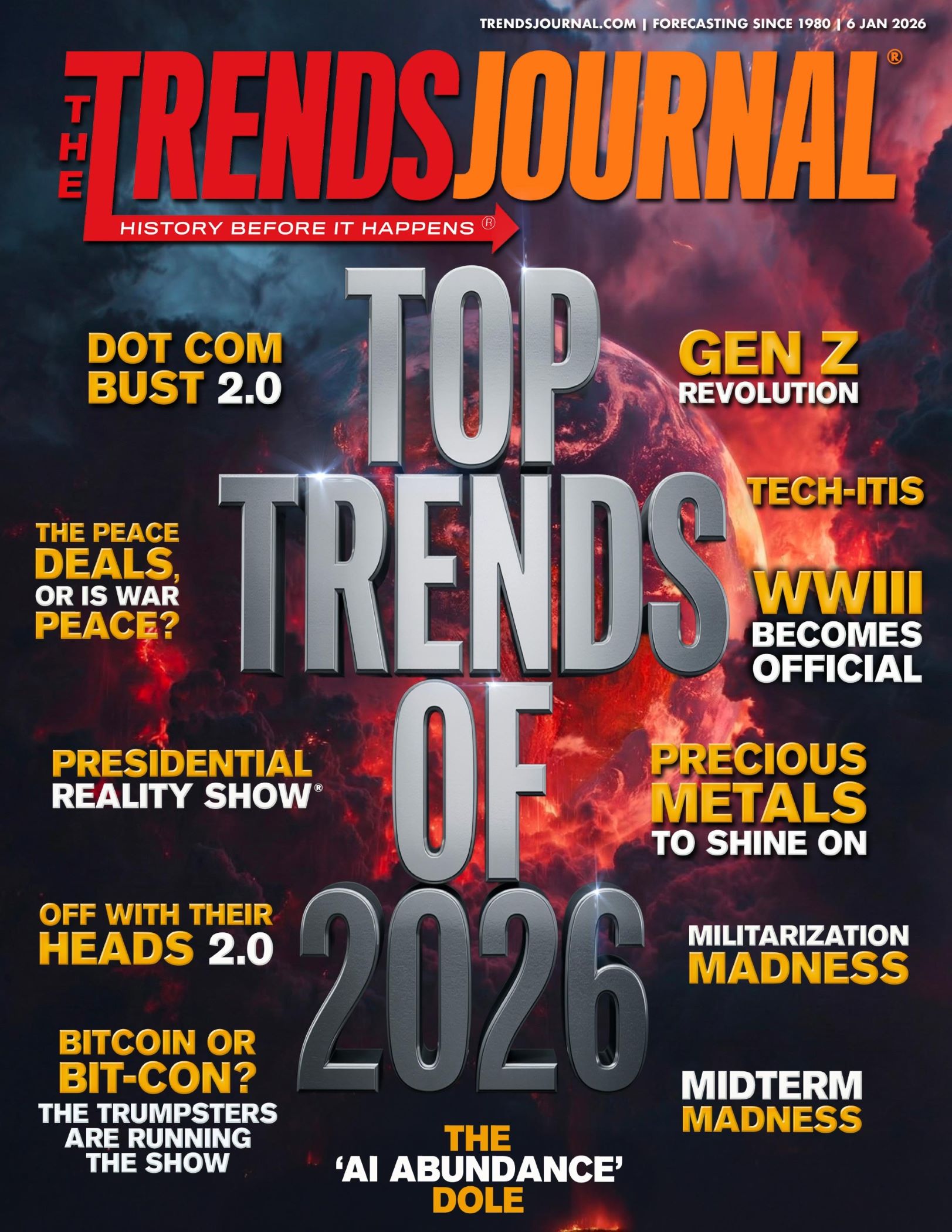 As we step into 2026, The Trends Journal has highlighted 12 trends that will shape the year ahead, including World War III. From political power plays leading up to midterm elections to militarization, from economic uncertainties to Dot-Com Bust 2.0 and GEN Z revolutions, our top trends will help you prepare, prevail and prosper in these unprecedented times ahead.