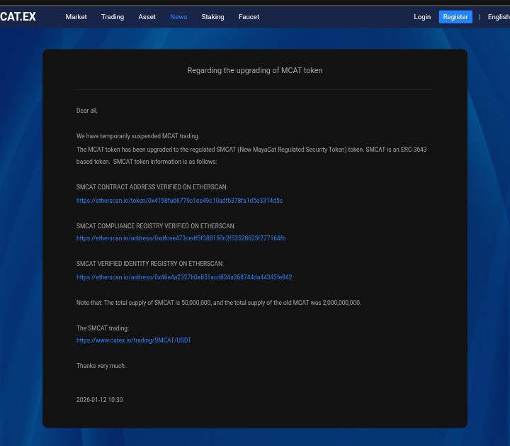 Following this milestone, UK Financial Ltd confirmed that it is actively coordinating with the CATEX Exchange to determine the most efficient and fully compliant method for completing the transition of legacy MayaCat (MCAT) tokens into the regulated SMCAT structure for eligible holders.